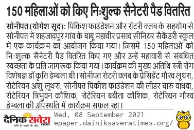 Free Sanitary Pad Donation &Menstrual Hygiene Awareness Workshop |Sonipat 7th September 2021